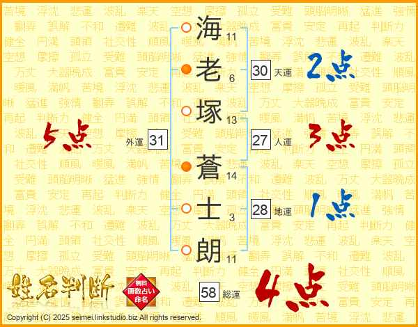 海(11画)老(6画)塚(13画) 蒼(14画)士(3画)朗(11画)