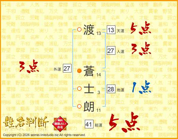 渡(13画) 蒼(14画)士(3画)朗(11画)
