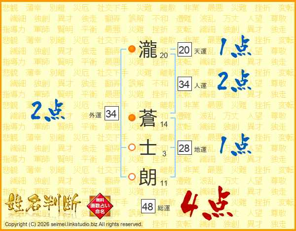 瀧(20画) 蒼(14画)士(3画)朗(11画)