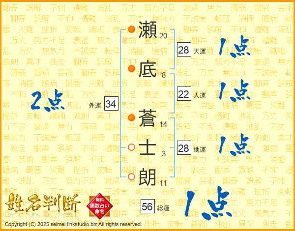 瀬(20画)底(8画) 蒼(14画)士(3画)朗(11画)
