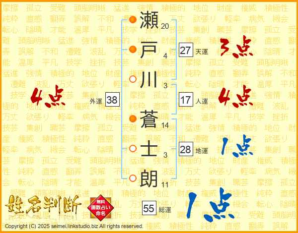 瀬戸川蒼士朗さんの外運は38画の4点!