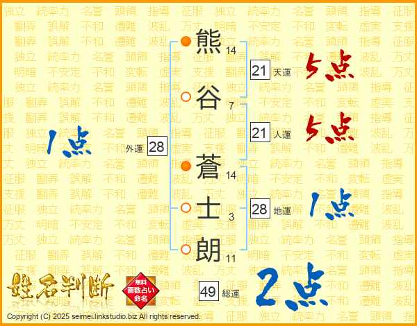 熊(14画)谷(7画) 蒼(14画)士(3画)朗(11画)