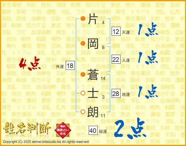 片(4画)岡(8画) 蒼(14画)士(3画)朗(11画)