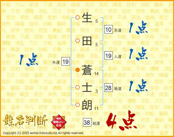 生(5画)田(5画) 蒼(14画)士(3画)朗(11画)