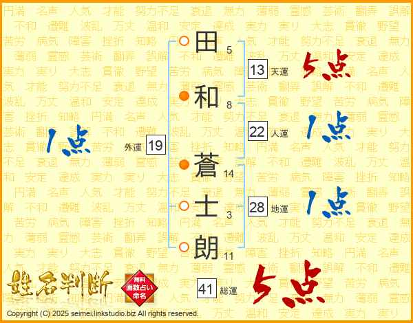 田(5画)和(8画) 蒼(14画)士(3画)朗(11画)
