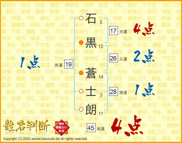 石(5画)黒(12画) 蒼(14画)士(3画)朗(11画)