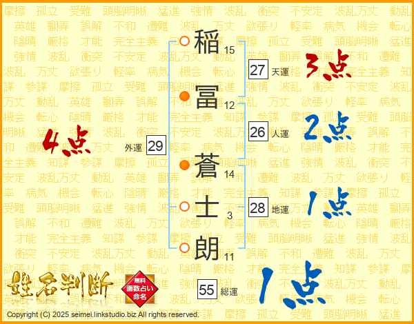 稲(15画)冨(12画) 蒼(14画)士(3画)朗(11画)