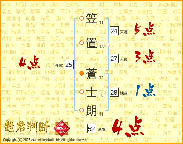 笠(11画)置(13画) 蒼(14画)士(3画)朗(11画)