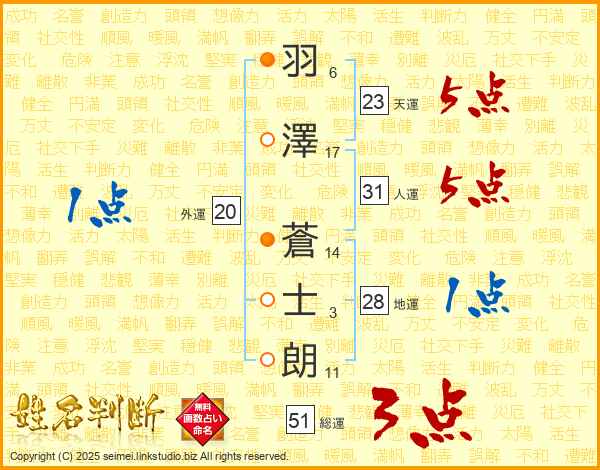 羽(6画)澤(17画) 蒼(14画)士(3画)朗(11画)