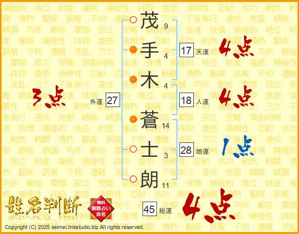 茂手木蒼士朗さんの天運は17画の4点!