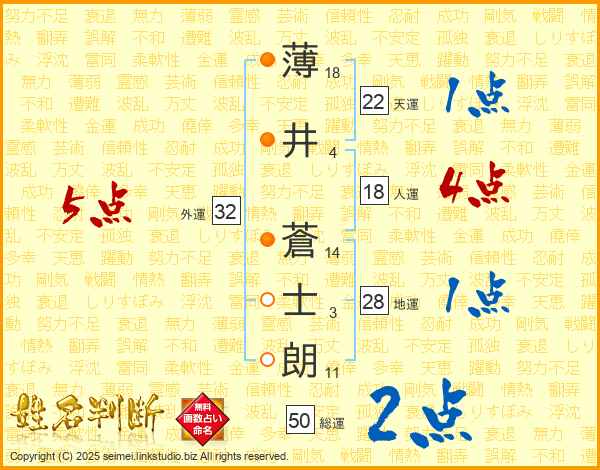 薄(18画)井(4画) 蒼(14画)士(3画)朗(11画)