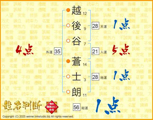 越(12画)後(9画)谷(7画) 蒼(14画)士(3画)朗(11画)