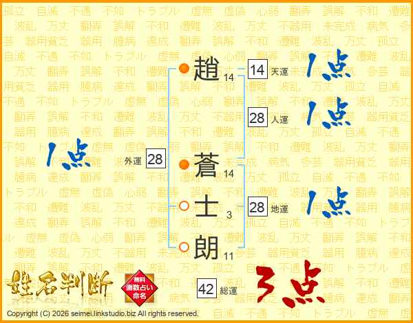 趙(14画) 蒼(14画)士(3画)朗(11画)
