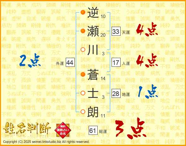 逆(10画)瀬(20画)川(3画) 蒼(14画)士(3画)朗(11画)