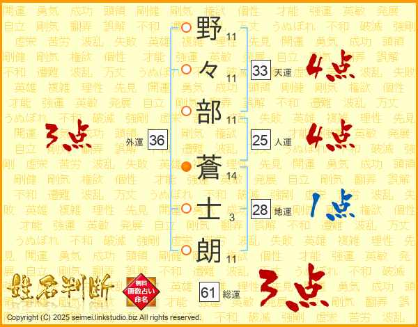 野(11画)々(11画)部(11画) 蒼(14画)士(3画)朗(11画)