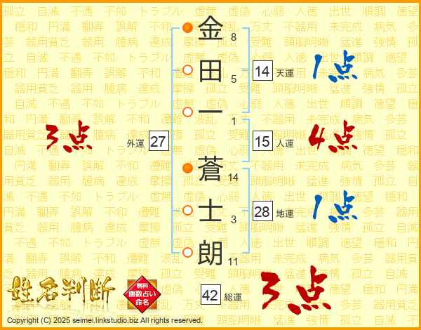 金(8画)田(5画)一(1画) 蒼(14画)士(3画)朗(11画)