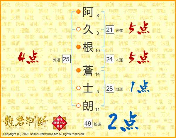 阿(8画)久(3画)根(10画) 蒼(14画)士(3画)朗(11画)