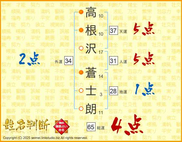 高(10画)根(10画)沢(17画) 蒼(14画)士(3画)朗(11画)