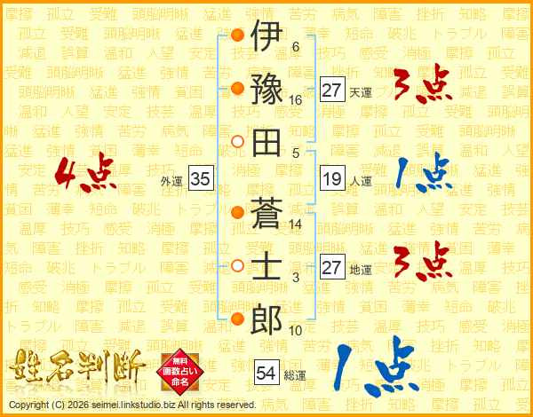伊(6画)豫(16画)田(5画) 蒼(14画)士(3画)郎(10画)