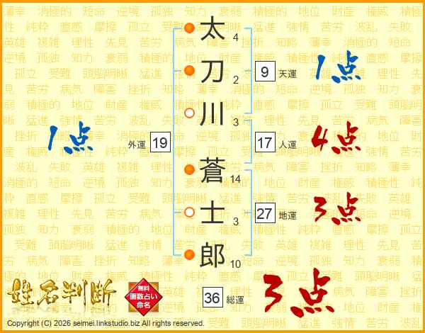 太(4画)刀(2画)川(3画) 蒼(14画)士(3画)郎(10画)
