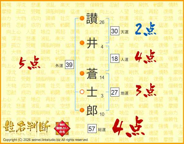 讃(26画)井(4画) 蒼(14画)士(3画)郎(10画)
