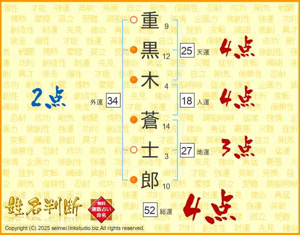 重(9画)黒(12画)木(4画) 蒼(14画)士(3画)郎(10画)