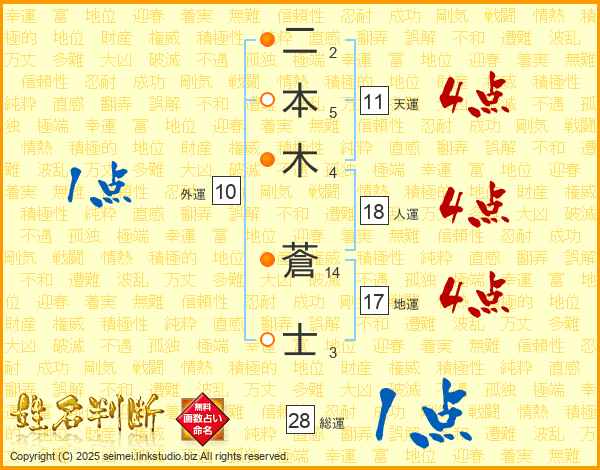生活面を象徴する運勢です。外部から受ける影響力を表し、結婚運、家庭運や職場、環境への順応性を表します。総運から人運を引いた画数。姓や名が1文字の場合を除く。