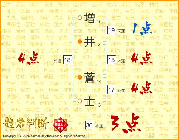 生活面を象徴する運勢です。外部から受ける影響力を表し、結婚運、家庭運や職場、環境への順応性を表します。総運から人運を引いた画数。姓や名が1文字の場合を除く。