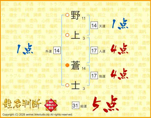 生活面を象徴する運勢です。外部から受ける影響力を表し、結婚運、家庭運や職場、環境への順応性を表します。総運から人運を引いた画数。姓や名が1文字の場合を除く。
