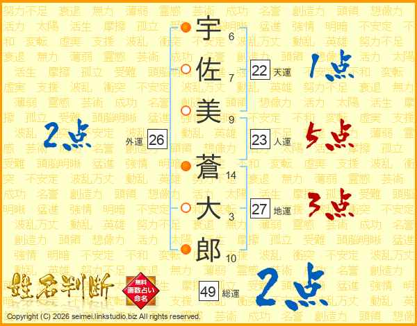 宇佐美蒼大郎さんの総運は49画の2点!