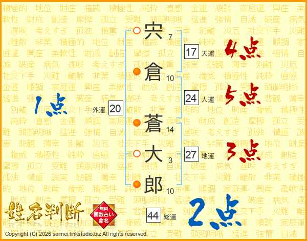 生活面を象徴する運勢です。外部から受ける影響力を表し、結婚運、家庭運や職場、環境への順応性を表します。総運から人運を引いた画数。姓や名が1文字の場合を除く。