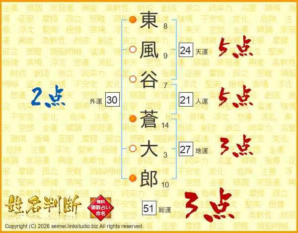 東風谷蒼大郎さんの総運は51画の3点!