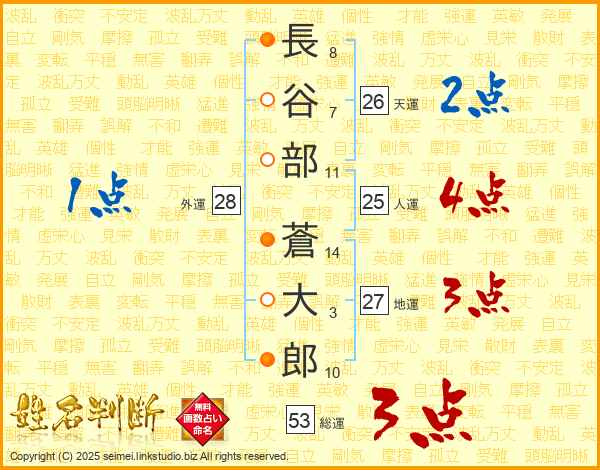 長(8画)谷(7画)部(11画) 蒼(14画)大(3画)郎(10画)