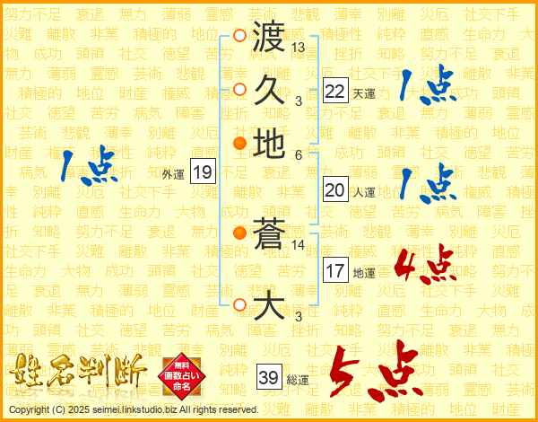 生活面を象徴する運勢です。外部から受ける影響力を表し、結婚運、家庭運や職場、環境への順応性を表します。総運から人運を引いた画数。姓や名が1文字の場合を除く。