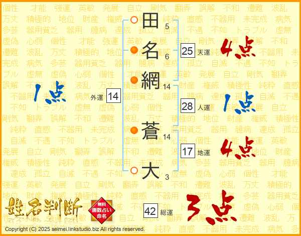 田(5画)名(6画)網(14画) 蒼(14画)大(3画)