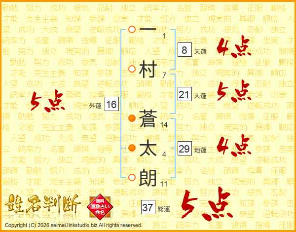 一(1画)村(7画) 蒼(14画)太(4画)朗(11画)
