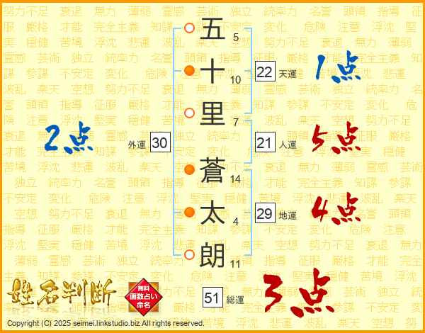 五(5画)十(10画)里(7画) 蒼(14画)太(4画)朗(11画)