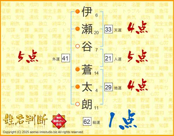 伊(6画)瀬(20画)谷(7画) 蒼(14画)太(4画)朗(11画)