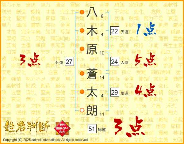 八(8画)木(4画)原(10画) 蒼(14画)太(4画)朗(11画)