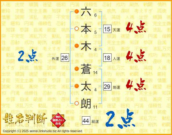 六(6画)本(5画)木(4画) 蒼(14画)太(4画)朗(11画)