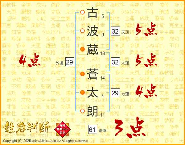 古(5画)波(9画)蔵(18画) 蒼(14画)太(4画)朗(11画)