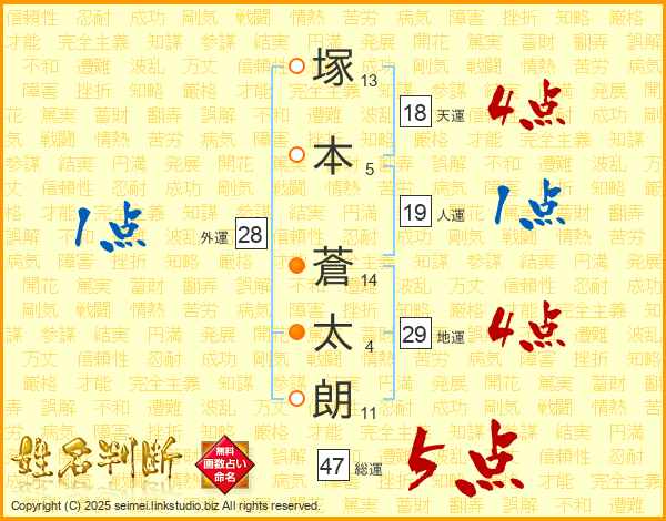 塚(13画)本(5画) 蒼(14画)太(4画)朗(11画)