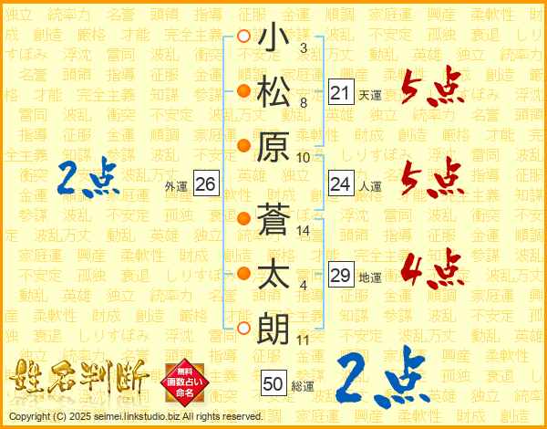 小(3画)松(8画)原(10画) 蒼(14画)太(4画)朗(11画)