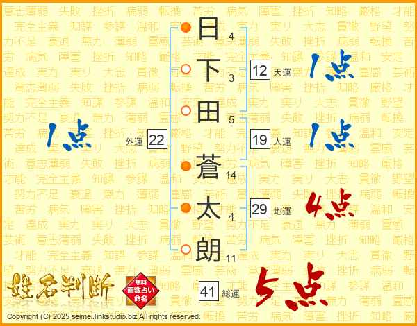 日(4画)下(3画)田(5画) 蒼(14画)太(4画)朗(11画)