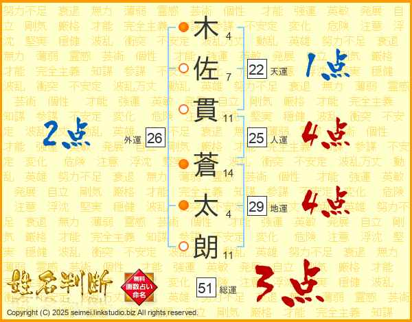 木(4画)佐(7画)貫(11画) 蒼(14画)太(4画)朗(11画)