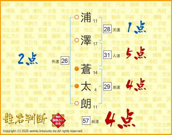 浦(11画)澤(17画) 蒼(14画)太(4画)朗(11画)