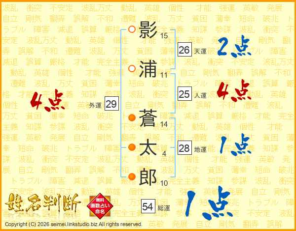 影(15画)浦(11画) 蒼(14画)太(4画)郎(10画)