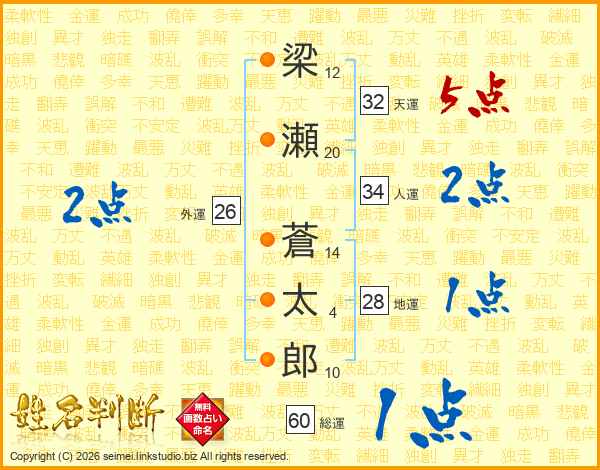 梁(12画)瀬(20画) 蒼(14画)太(4画)郎(10画)