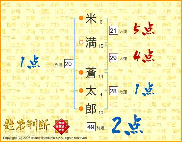 米(6画)満(15画) 蒼(14画)太(4画)郎(10画)