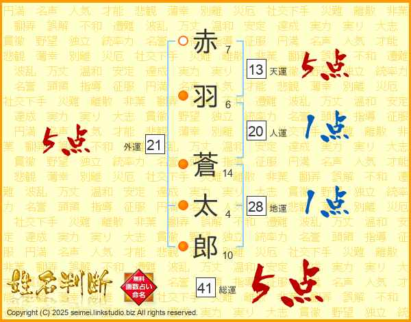 赤(7画)羽(6画) 蒼(14画)太(4画)郎(10画)
